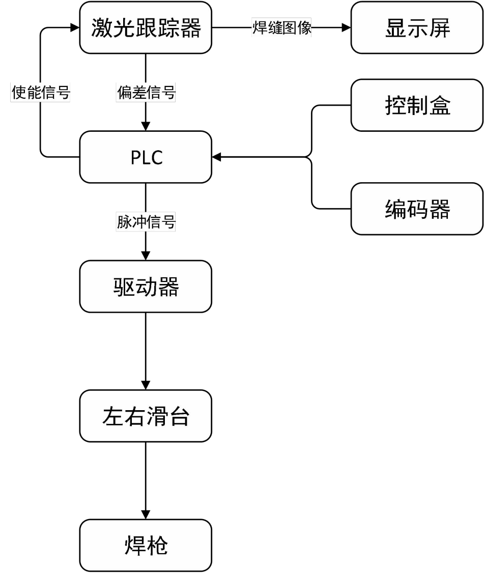 如图 下图所示,设备包含激光跟踪器,人机界面,微嵌屏,PLC 控制柜,驱动器, 跟踪滑台,摆动滑台,控制盒。激光焊缝跟踪器通过激光发射与接收,经过内部算法处理得到焊缝图像与偏差信号。焊缝图像通过网口传送给显示屏,显示屏显示图像。伺服编码器计算旋转电机的旋转脉冲数,转换成行走距离,发给 PLC 用于实现多层多道。跟踪器检测出的正确焊缝位置数据,通过以太网通讯发给 PLC,经过 PLC 运算处理转化成脉冲信号发送给驱动器,从而调正焊枪位置、摆幅宽度,与焊接速度。