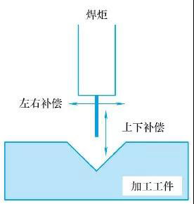 机器人自主焊接,为焊接机器人加上跟踪功能,通过传感设备实现对焊缝的数据进行采集、分析,获取焊缝的尺寸、坐标、形状等信息,按照事先设定的增益、偏差等参数值,对焊枪上下和左右方向进行补偿。