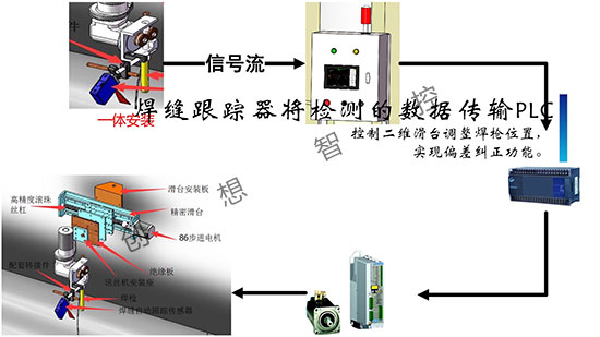 焊缝跟踪器将检测的数据传输PLC,控制二维滑台调整焊枪位置,实现偏差纠正功能。