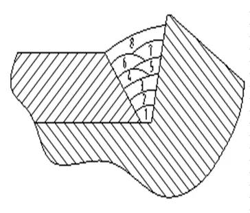 如果焊接焊脚尺寸大于12mm以上的焊件时,可采用三层六道、四层十道来完成, 如下图所示。焊脚尺寸越大,焊接层数、道数就越多。