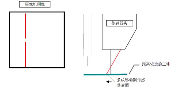 由于激光条纹是以一定的角度投影的,如果工件同传感器距离太近,激光条纹的位置就相对靠前。反过来,如果工件同传感器距离远一些,工件表面激光条纹的位置相对靠后。摄像机观察激光条纹的位置,传感器能够测量距离工件的垂直距离。从条纹的形状上看,传感器也能够测量表面的轮廓和焊缝在条纹上的位置,这就允许传感器测量焊缝的横向位置。