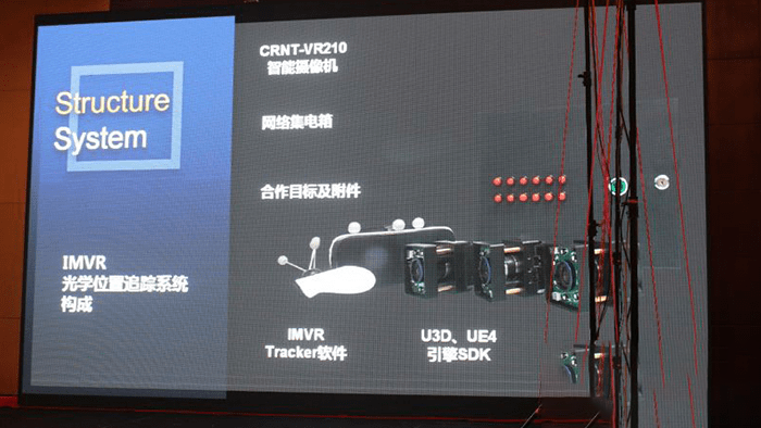 该系统采用的是红外追踪方案,整套系统包含:两个或两个以上CRNT-VR210智能摄像机、IMVR Tracker软件、U3D及UE4引擎SDK、网络集控箱、空间标定及合作目标套件。