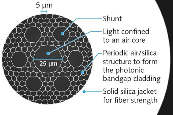 中空光纤使用诸如光子带隙或反谐振之类的现象将光引导通过空气填充的芯。经过多年的研究,这种光纤的光损耗已大大降低。这种光纤的一大优点是更高的数据传输速度,因为光在空气中的传播比在玻璃中的传播快得多。今年,新推出了一种光子带隙空心光纤,该光纤的市场特别重视高速传输高频要求。 该光纤可以替代微波塔和数据中心之间“最后一英里”连接中的微波传输。与玻璃纤维相比,它的速度优势使数据交换之间的间隔时间缩短了宝贵的毫秒。