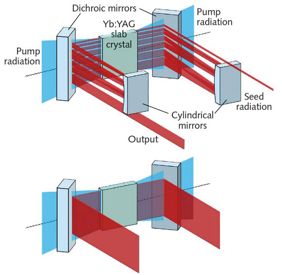 虽然皮秒和飞秒光纤激光器具有许多非凡的质量,但是对于最高平均功率的超快光,人们必须转向大体积固态激光器。研究人员不仅致力于克服超快激光功率限制,而且还致力于开发从脉冲产生到工艺技术以及实际应用的整个工艺链中的技术。使用InnoSlab技术(两个散热器之间的矩形晶体,通过准直激光二极管纵向泵浦),已构建了一种超快放大器,该放大器以500 kHz的频率发射能量略大于1 mJ的压缩脉冲,平均功率为530 W。使用充气的Herriott型电池,研究人员已证明脉冲持续时间从590降低到30 fs,而能量损失不到5%。