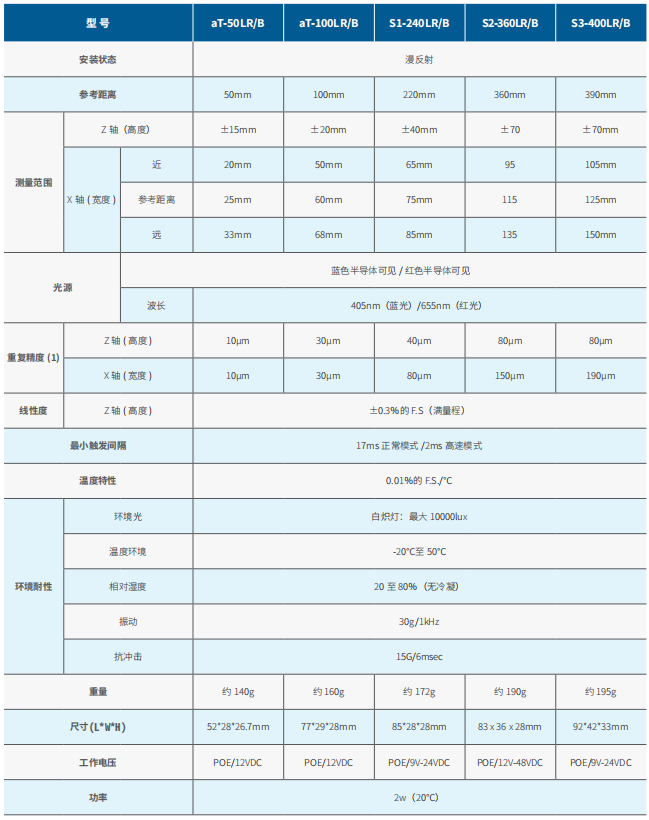 品牌名为小不点aTINY,全系列产品可支持30-400mm的检测距离(Z轴范围),红激光系列可支持0.01mm的检测精度,蓝紫激光系列可支持0.005mm的检测精度。